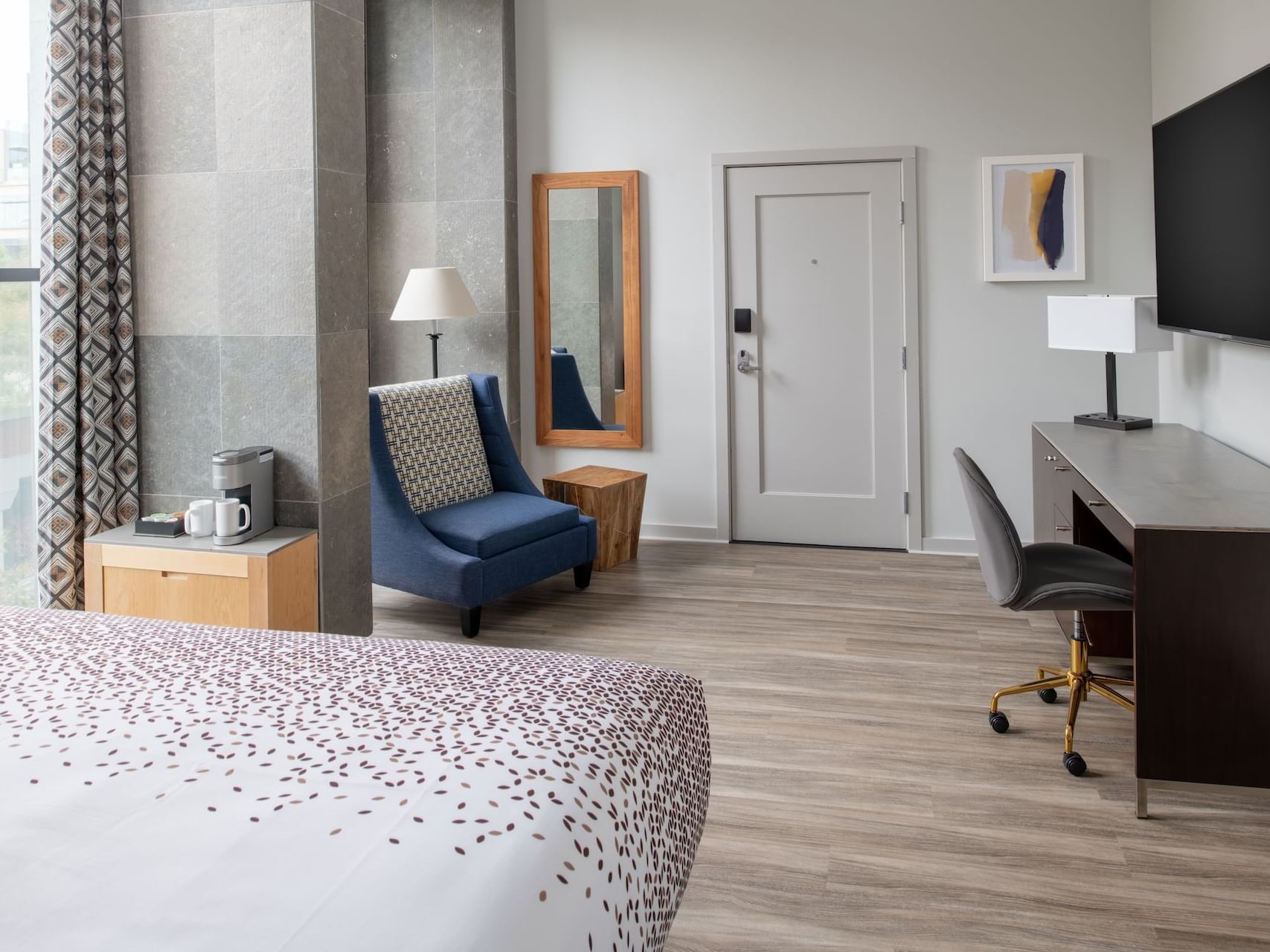 Perfect for guests looking for a healthy stay. Featuring one king bed, a Peloton Bike, in-room fit kit, mini- fridge, floor-to-ceiling windows with city views, flatscreen TV with streaming services, and more!