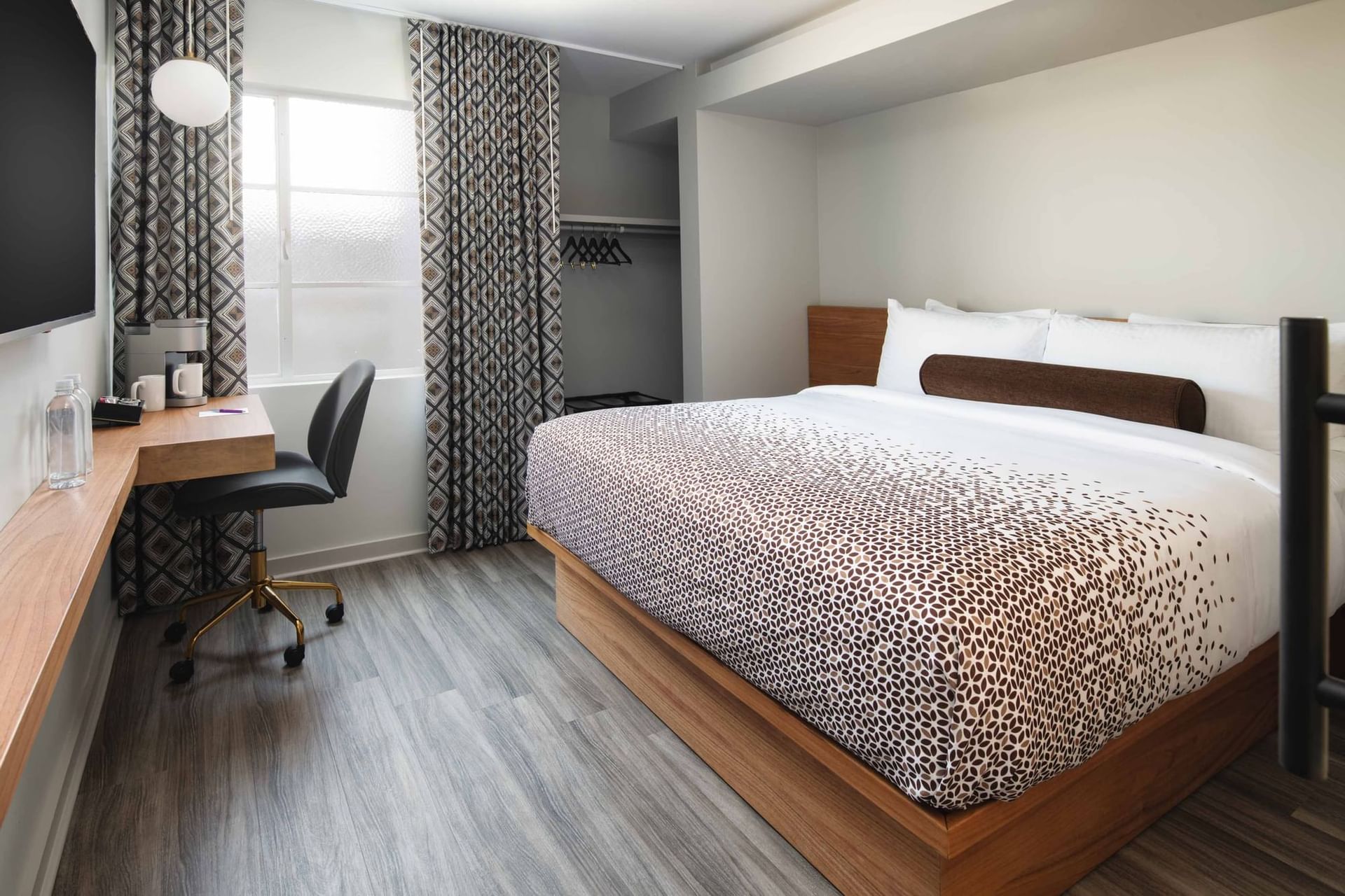 Perfect for guests looking for a healthy stay. Featuring one king bed, a Peloton Bike, in-room fit kit, mini- fridge, floor-to-ceiling windows with city views, flatscreen TV with streaming services, and more!